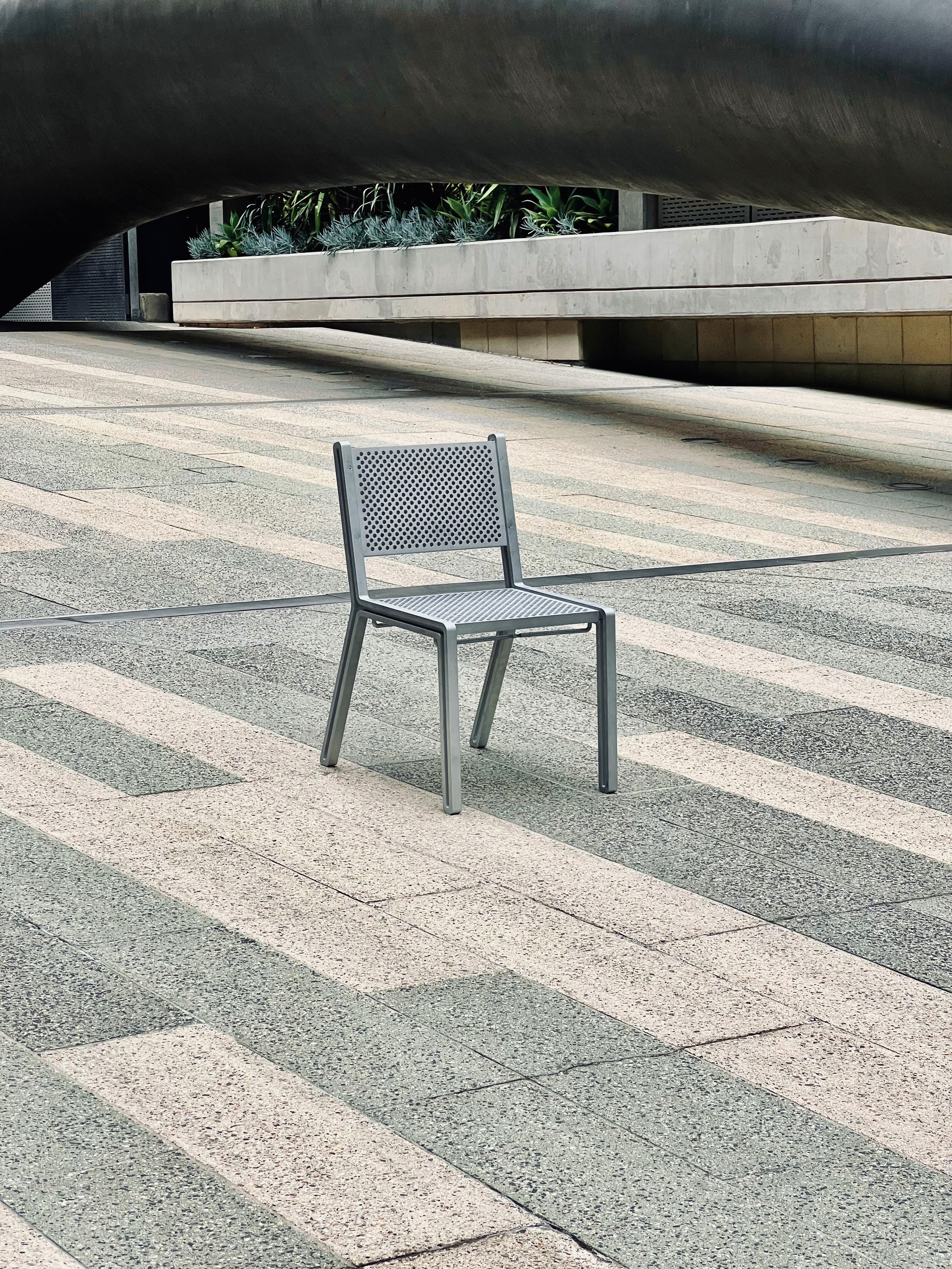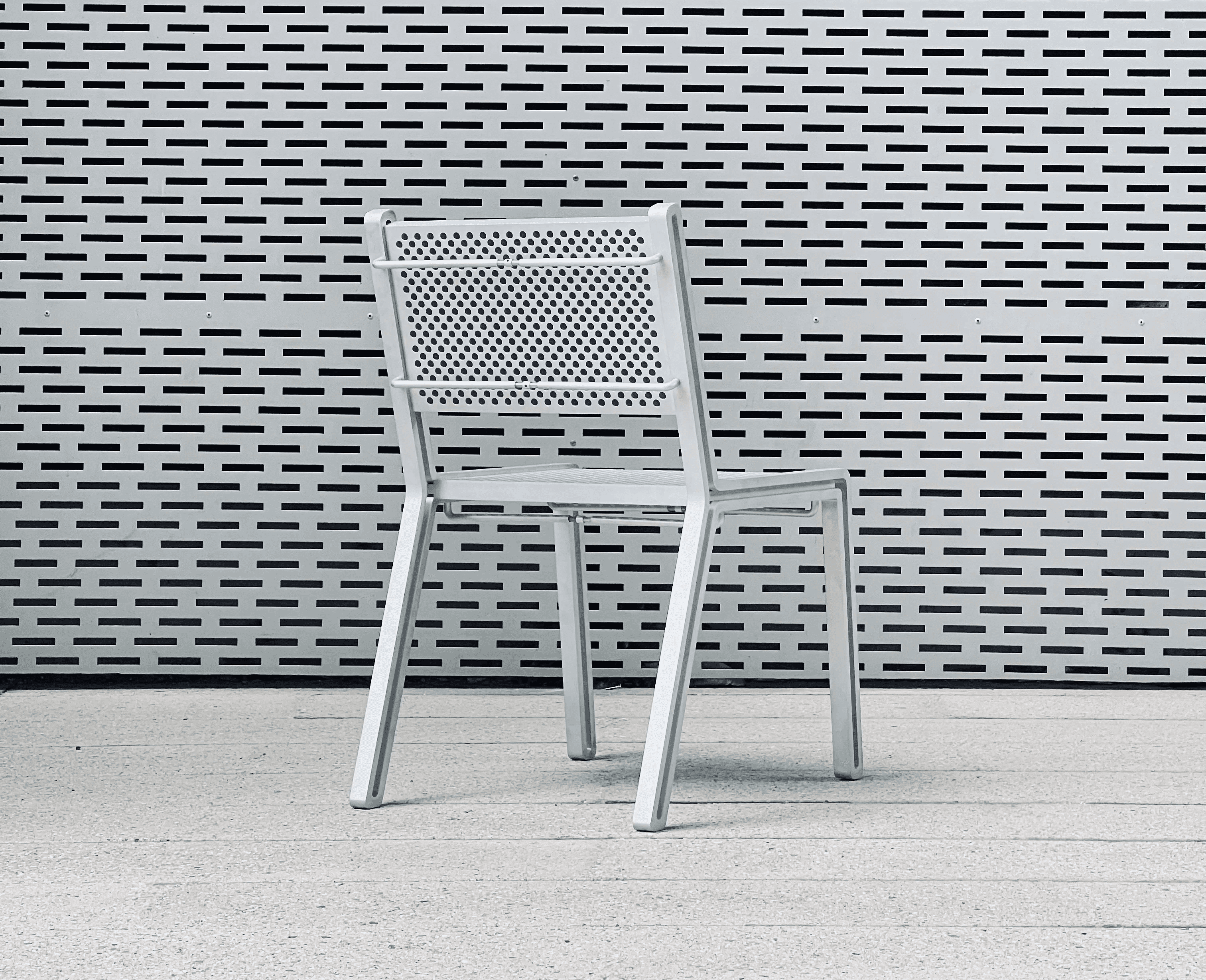 Eric is a flat-pack, clamp-assembled chair crafted from solid sandblasted aluminium and stainless steel. Precision spindles lock the panels together, with two clamps on the backrest and two beneath the seat, creating a stable, weighty form that commands attention.